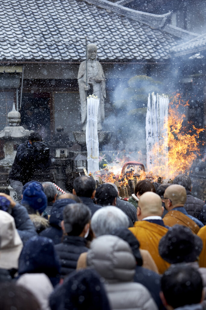 「福だるま供養(お焚き上げ」) 法要終了後、昨年一年間お守りいただいた福だるまに感謝の気持ちを込め、境内で古だるまのお焚き上げを行います。